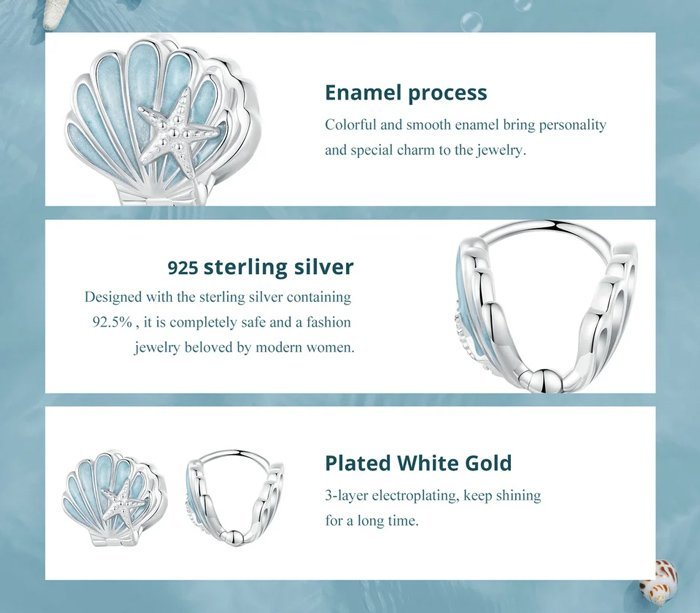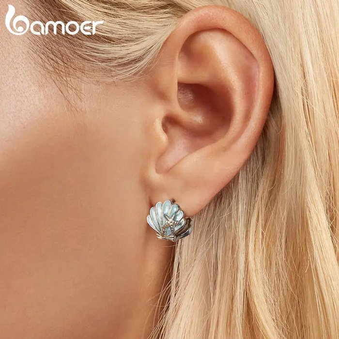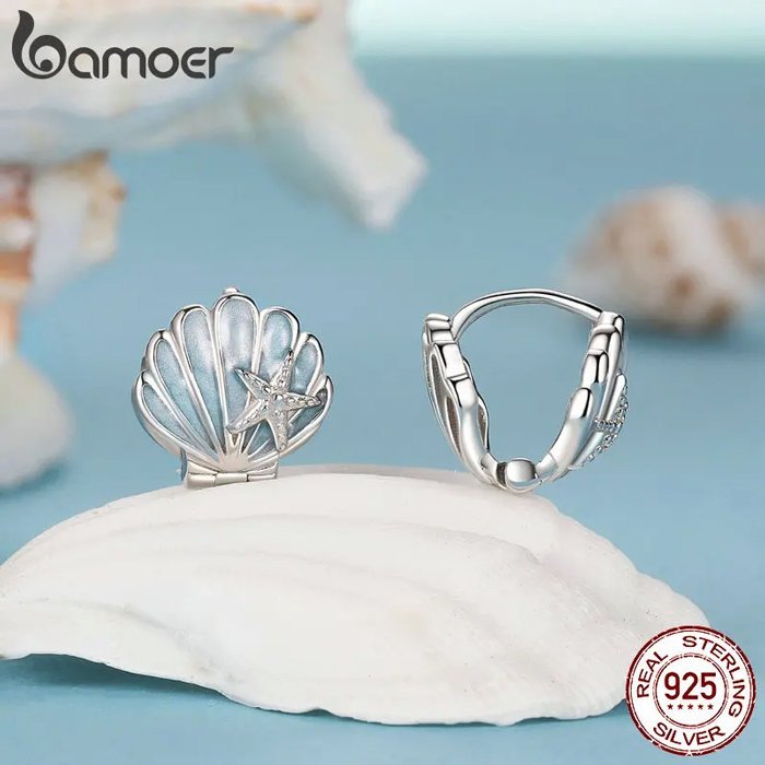 BAMOER σκουλαρίκια κρίκοι BSE1011 σε σχήμα κοχύλι, ασήμι 925, ασημί/μπλε
