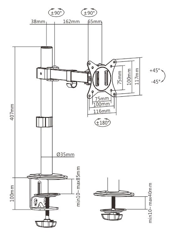 Πάχος επιφάνειας εργασίας: Clamp: 10~85mm, Grommet: 10~40mm