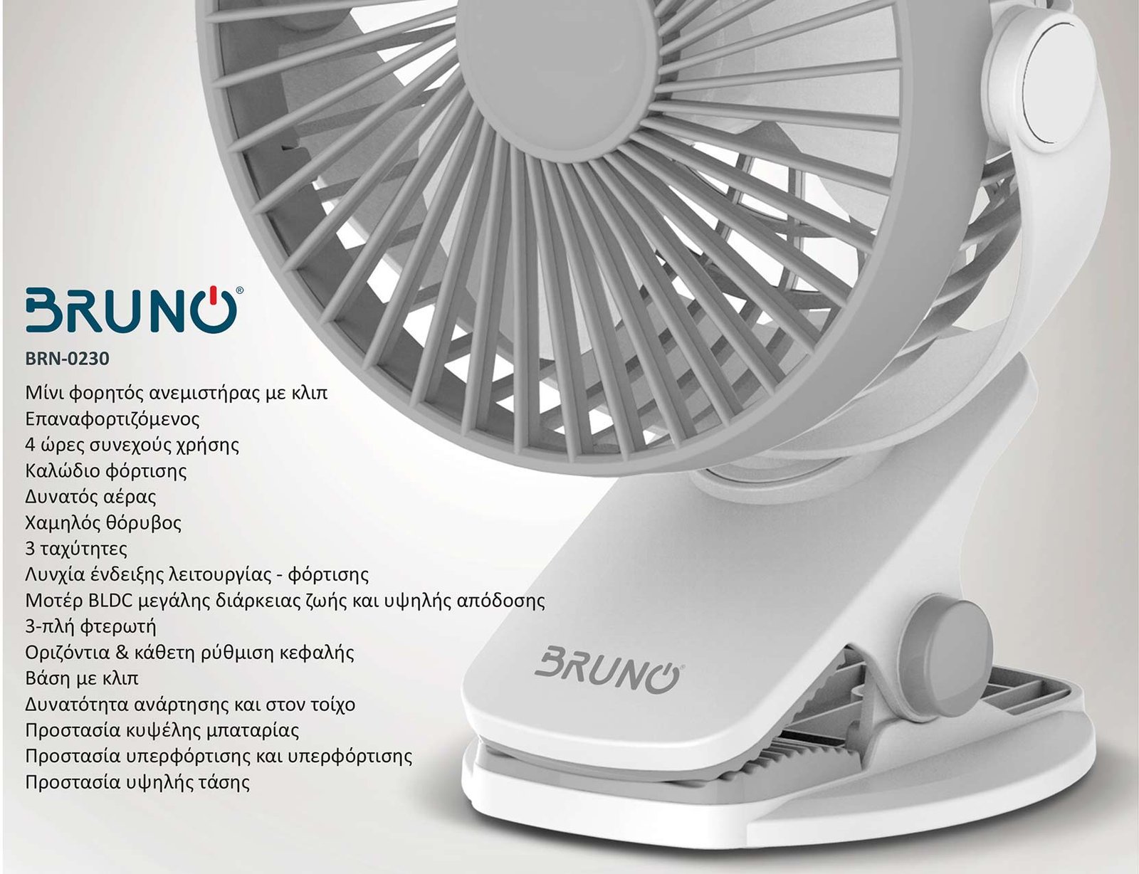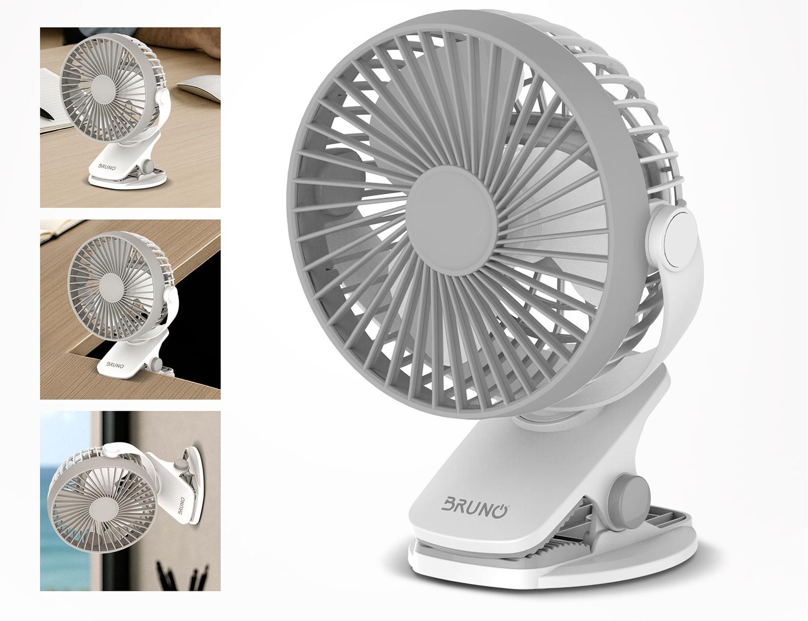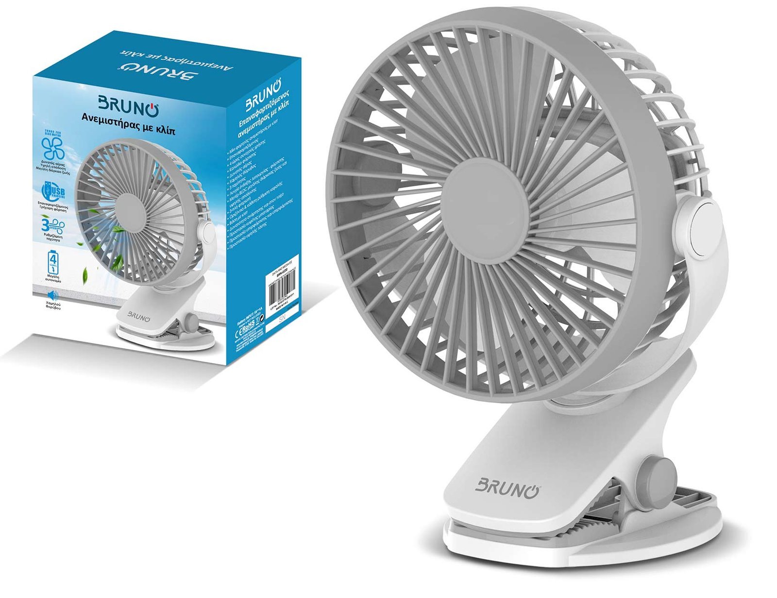 BRUNO ανεμιστήρας με κλίπ BRN-0230, επαναφορτιζόμενος, λευκός/γκρι