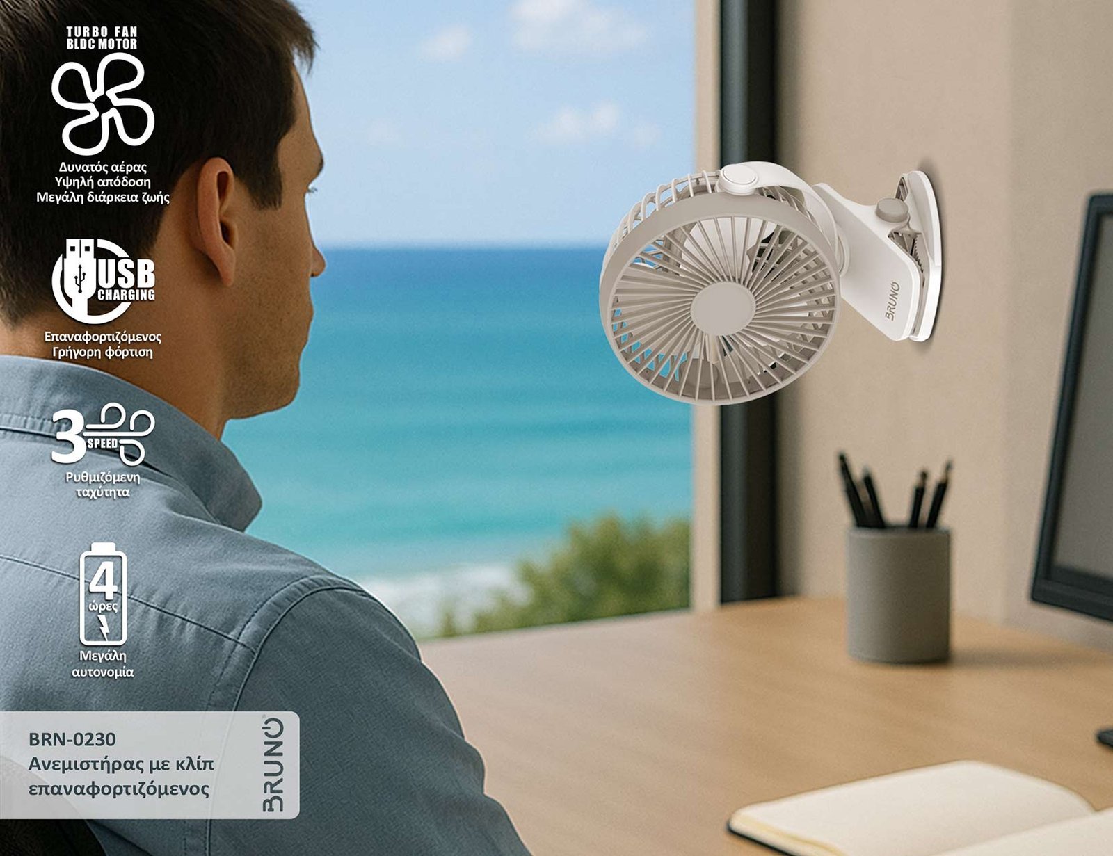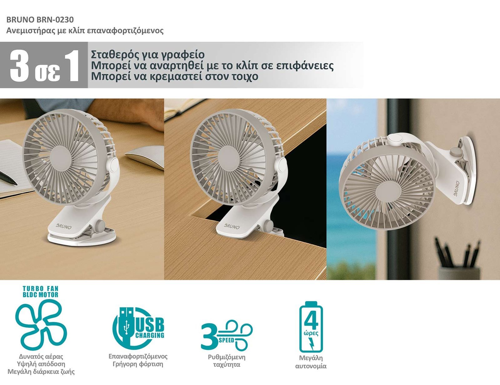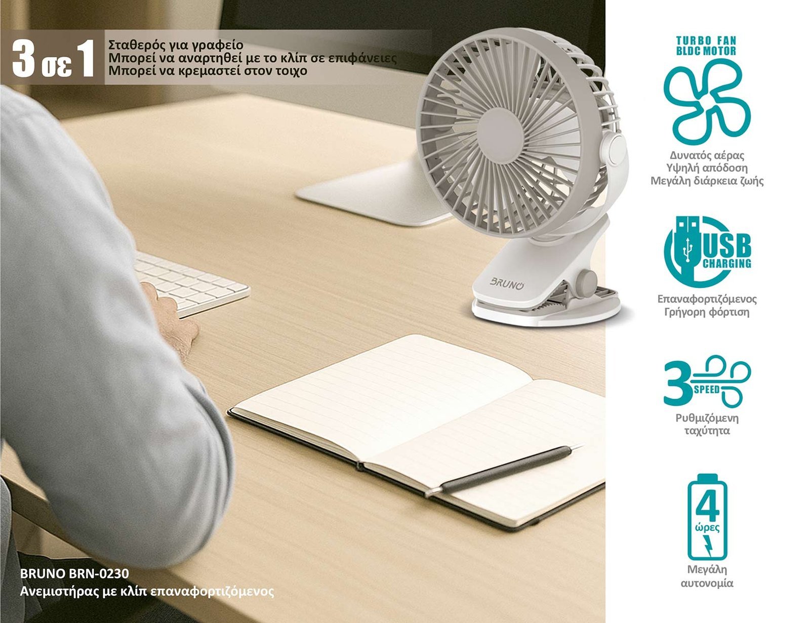 BRUNO ανεμιστήρας με κλίπ BRN-0230, επαναφορτιζόμενος, λευκός/γκρι