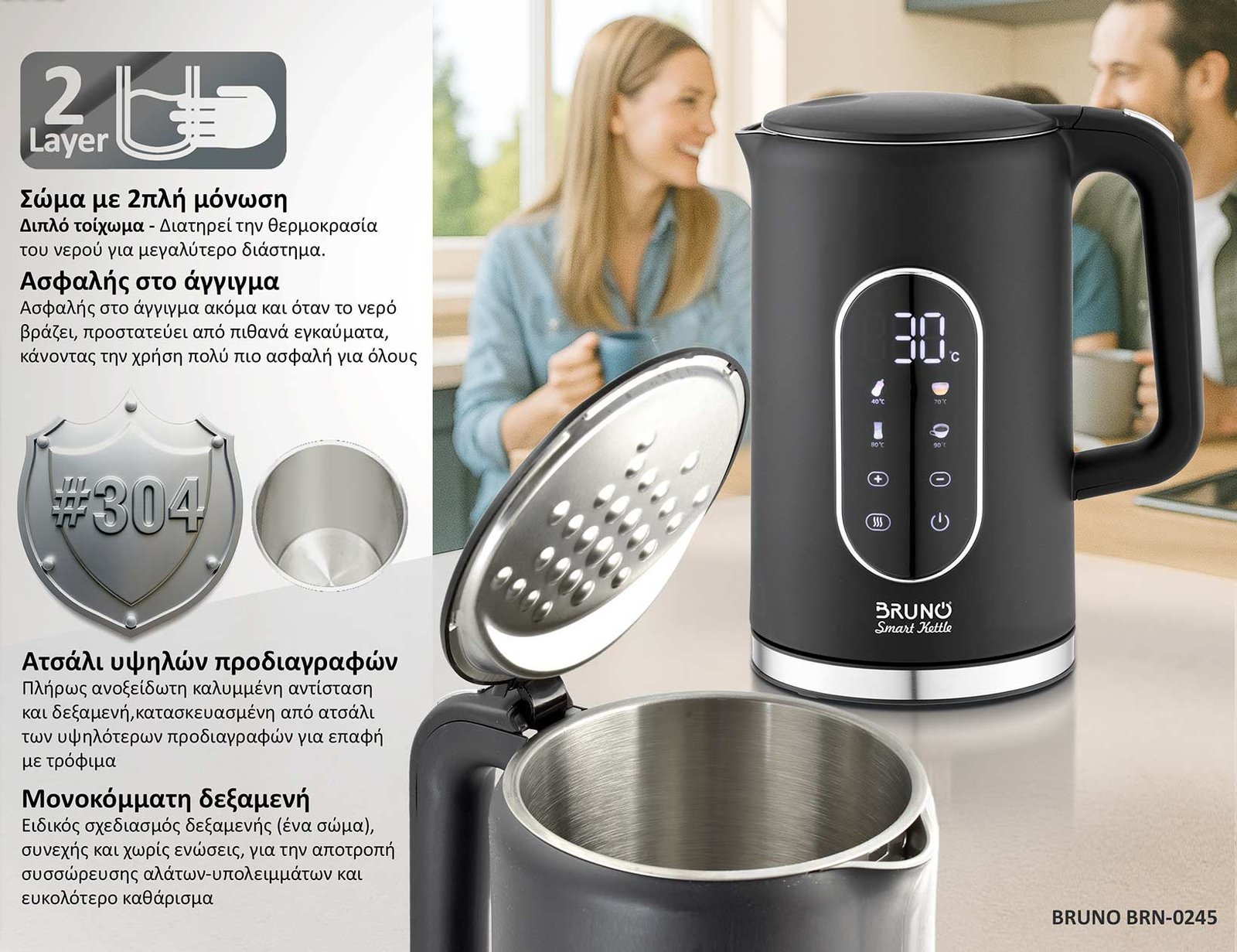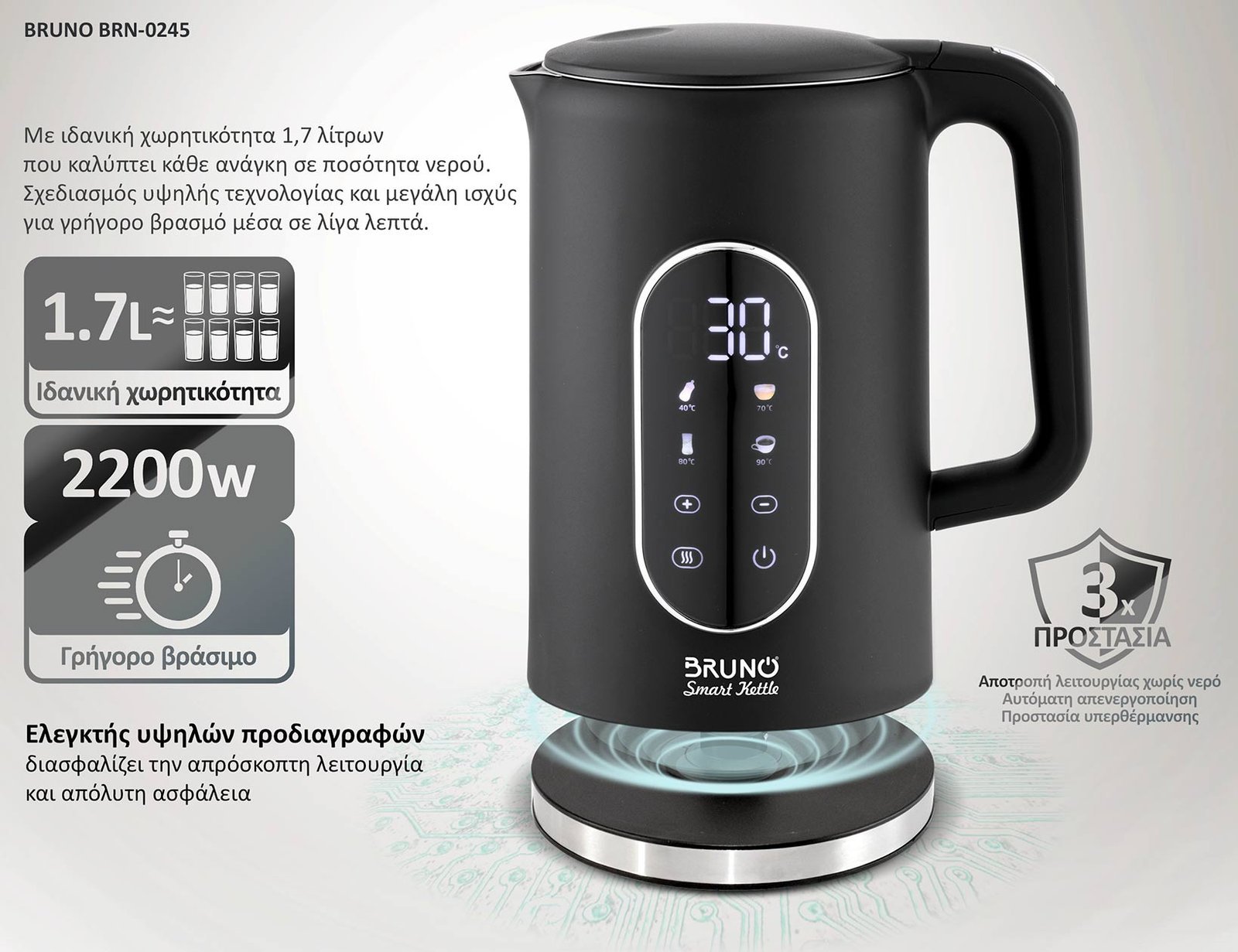 BRUNO βραστήρας νερού προηγμένων λειτουργιών BRN-0245, ψηφιακός, με διπλό τοίχωμα, 1.7L, 2200W, μαύρος