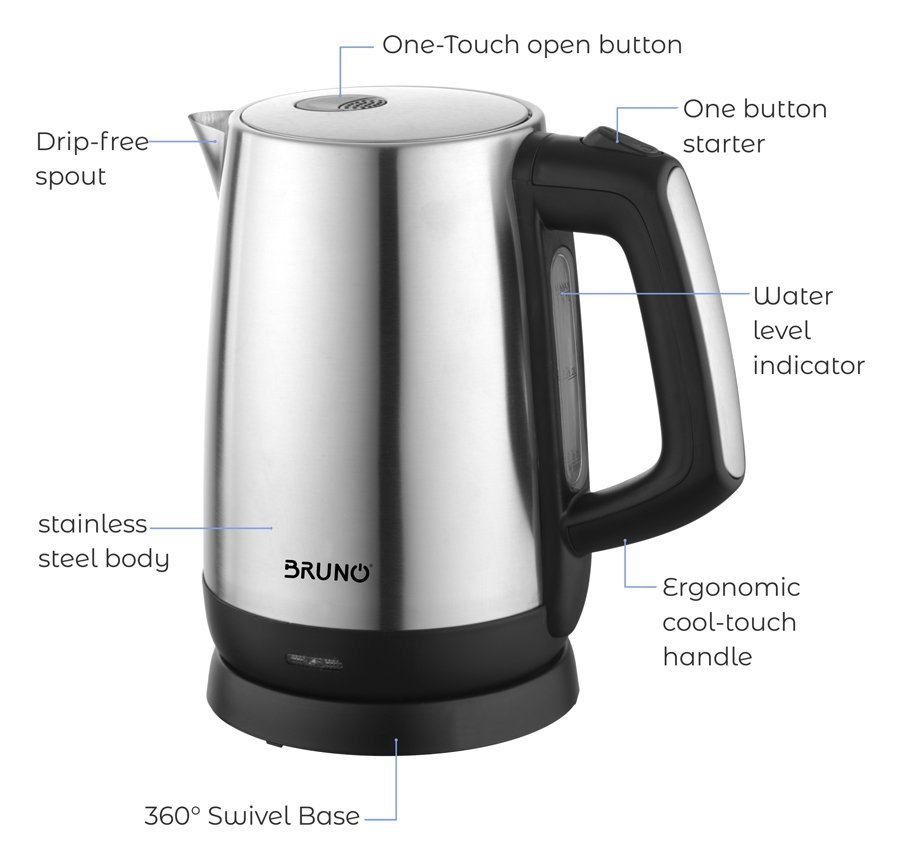 Ηλεκτρικός βραστήρας εξαιρετικής απόδοσης της BRUNO με ισχύ 2200W και χωρητικότητα 1,7 lt. Εξοπλίζεται με περιστρεφόμενη βάση 360° και εργονομική λαβή για εύκολο κράτημα. Επιπλέον διαθέτει σύστημα ασφαλείας κατά του βρασμού χωρίς νερό και σύστημα αυτόματης διακοπής βρασμού.