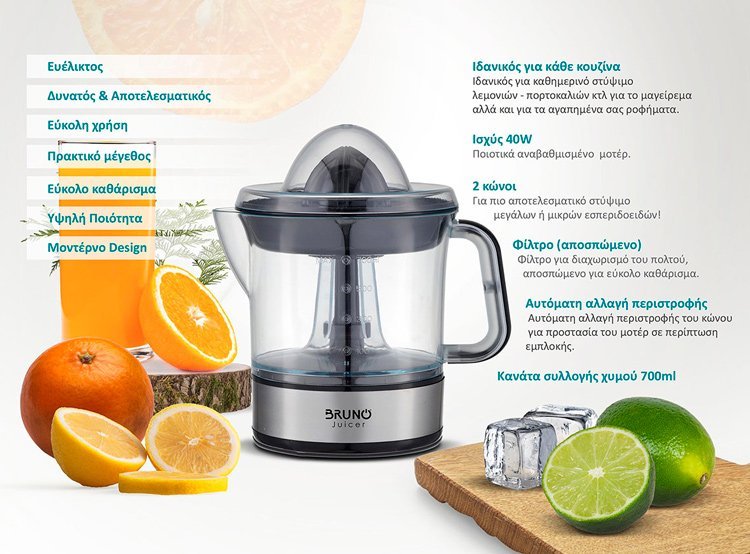 Ηλεκτρικός στίφτης Bruno, ιδανικός για καθημερινό στύψιμο εσπεριδοειδών φρούτων όπως λεμόνια και πορτοκάλια, για το μαγείρεμα αλλά και για τα αγαπημένα σας ροφήματα.