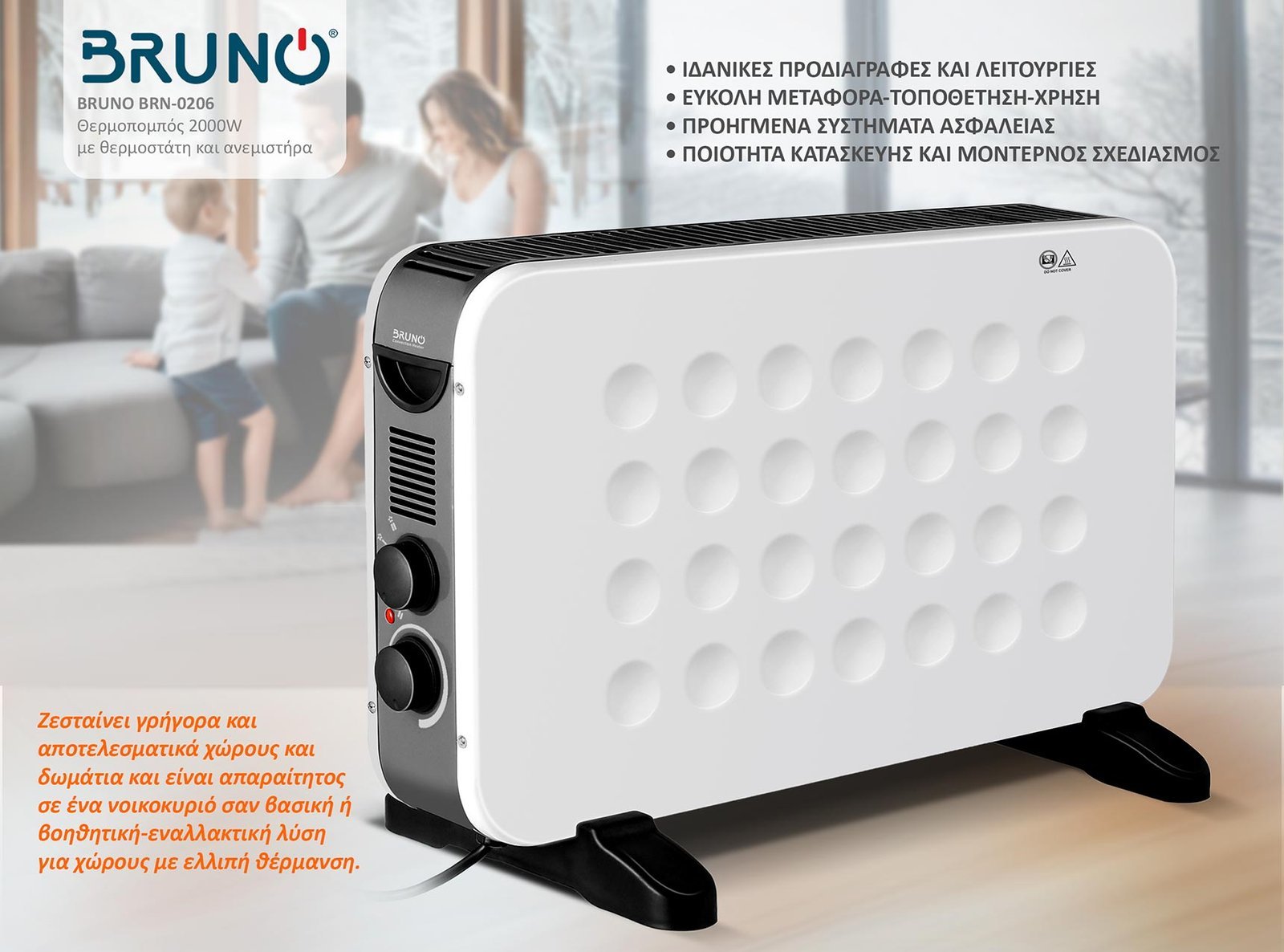 Ο θερμοπομπός BRUNO BRN-0206 ζεσταίνει γρήγορα και αποτελεσματικά χώρους και δωμάτια και είναι απαραίτητος σε ένα νοικοκυριό σαν βασική ή βοηθητική-εναλλακτική λύση για χώρους με ελλιπή θέρμανση.