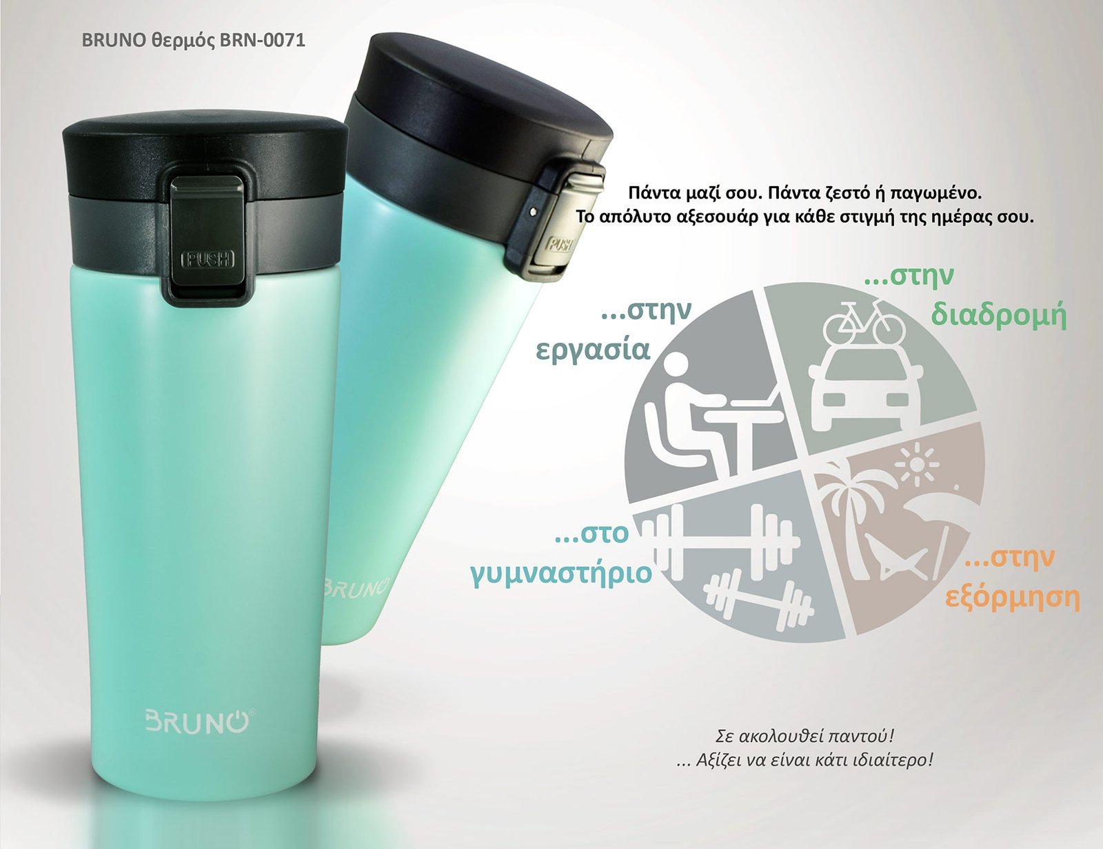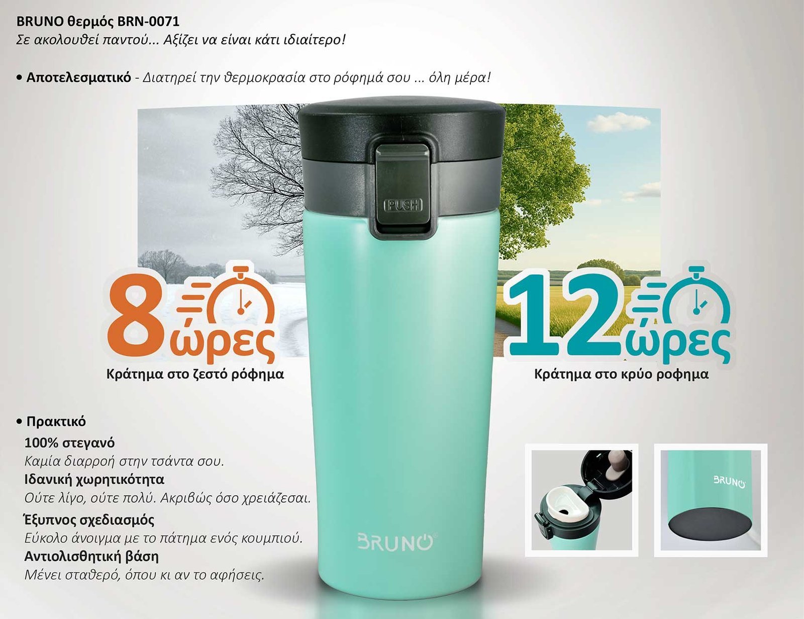 Θερμός της Bruno, κατασκευασμένος από υψηλής ποιότητας υλικά, απαλλαγμένος από BPA και με προσεγμένη, εργονομική σχεδίαση.