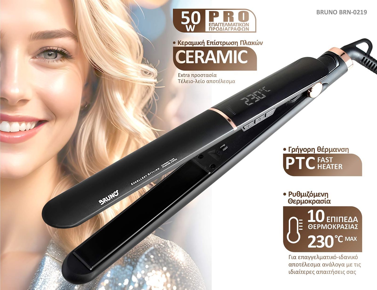 BRUNO ισιωτική πρέσα μαλλιών BRN-0219 με κεραμικές πλάκες, 50W, ψηφιακή ένδειξη, black-copper