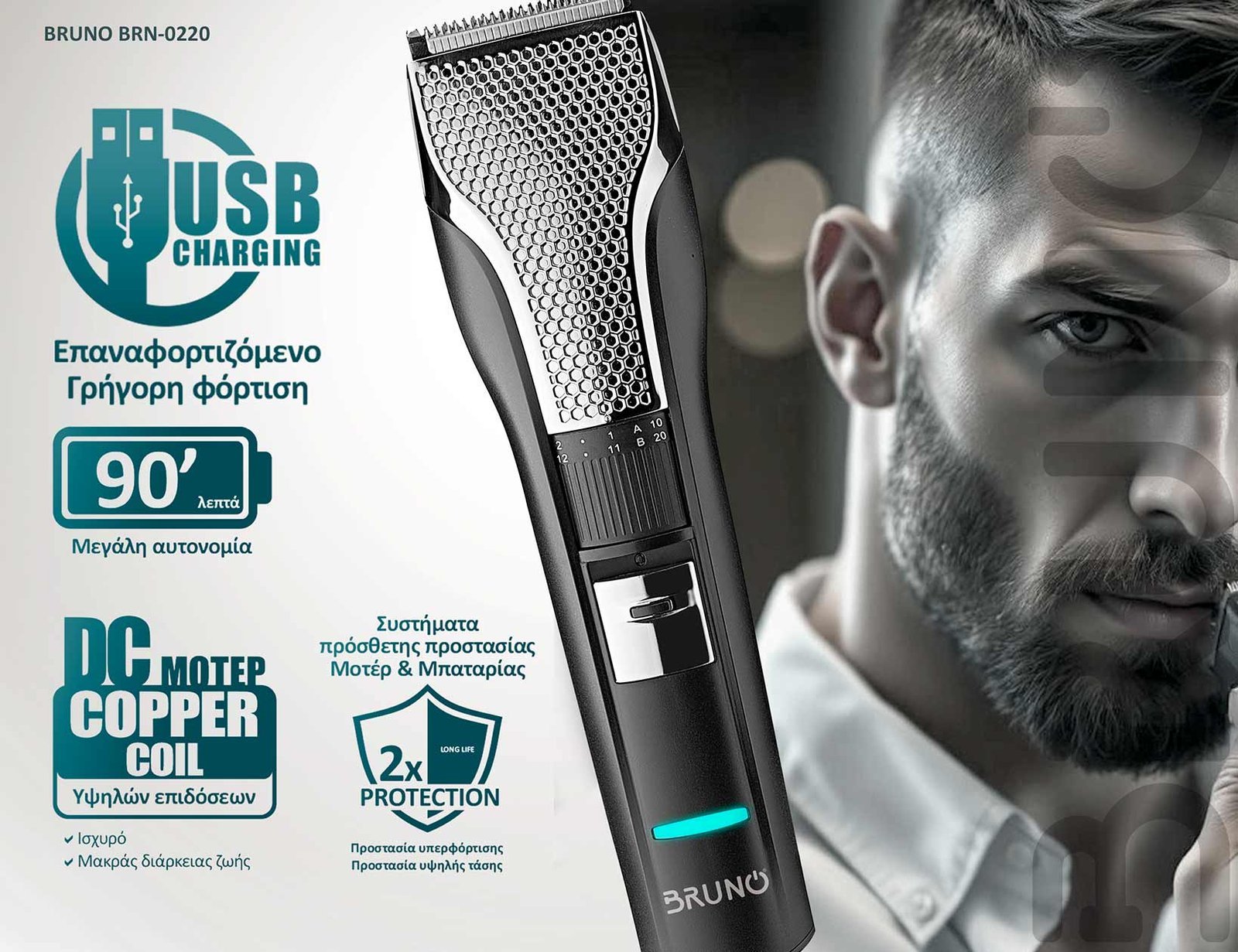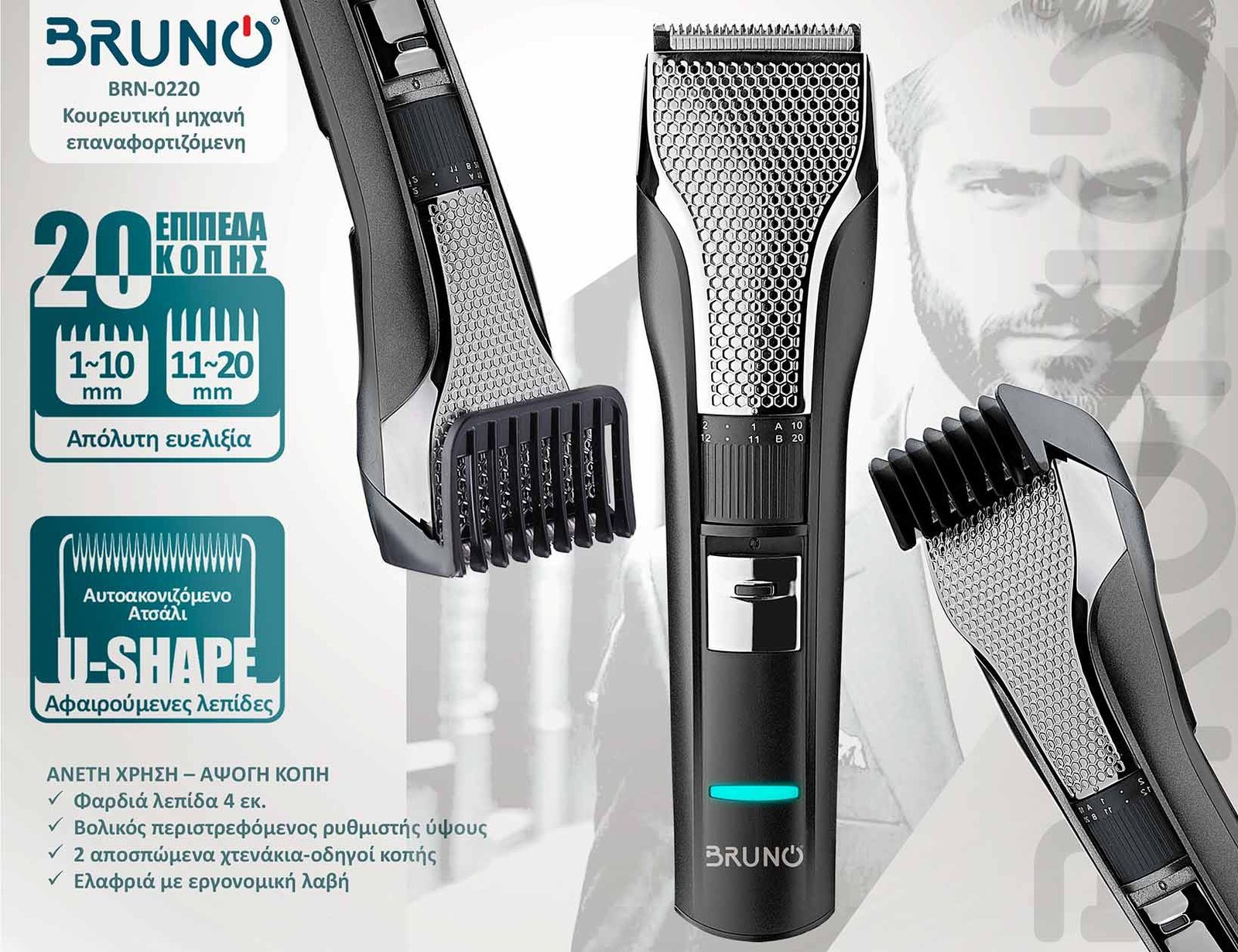 Η επαναφορτιζόμενη κουρευτική μηχανή BRUNO BRN-0220, είναι ιδανική για τριμάρισμα ή κούρεμα σε μαλλιά και γένια.