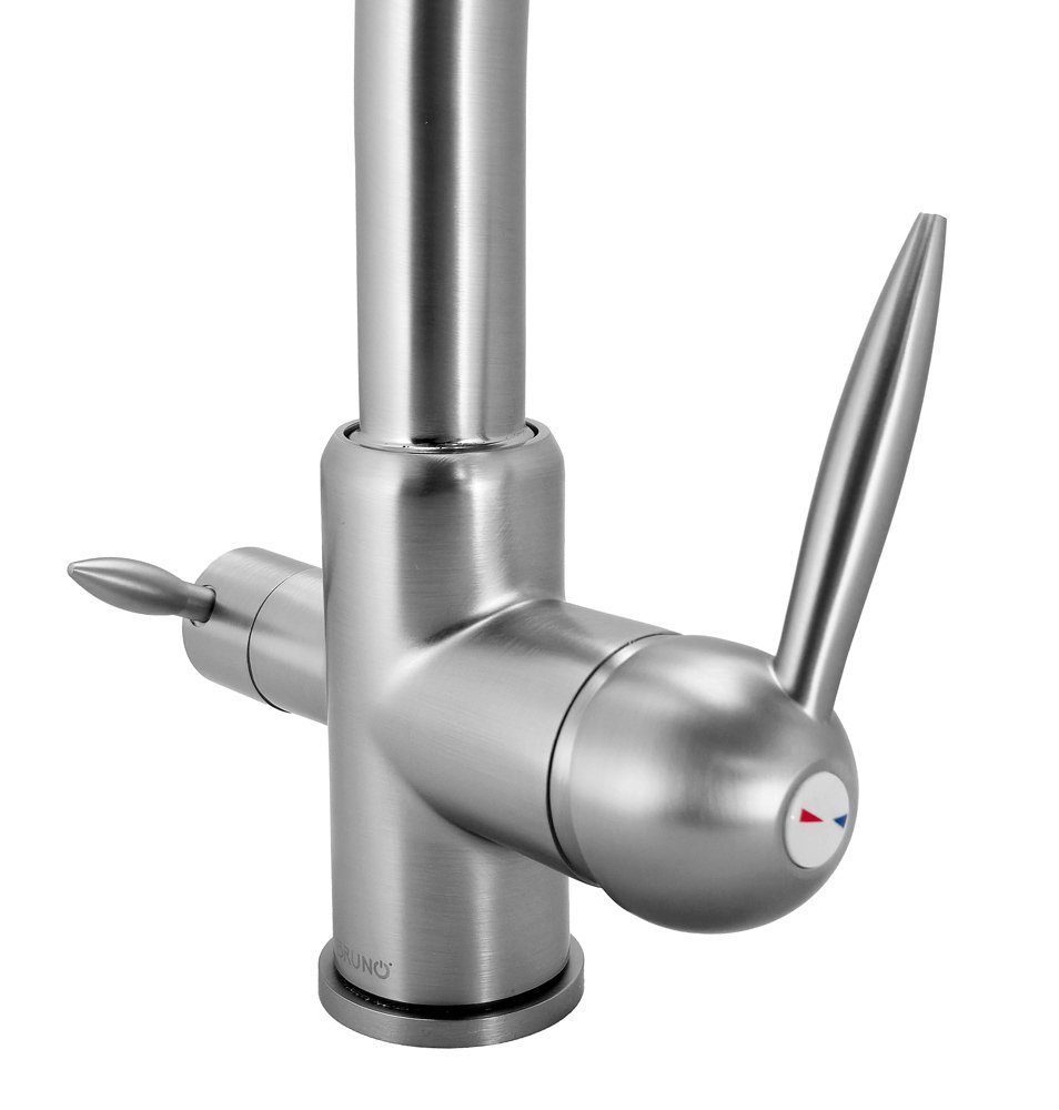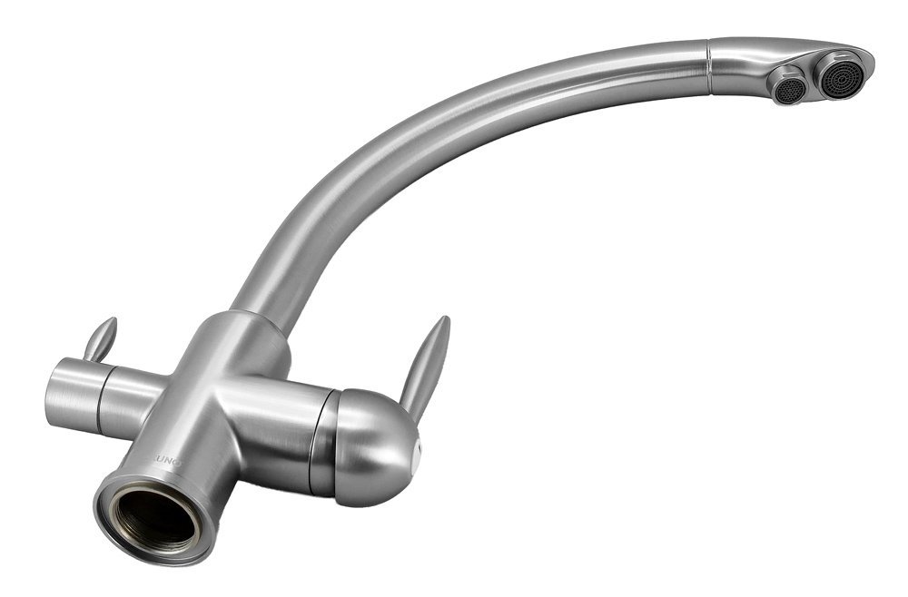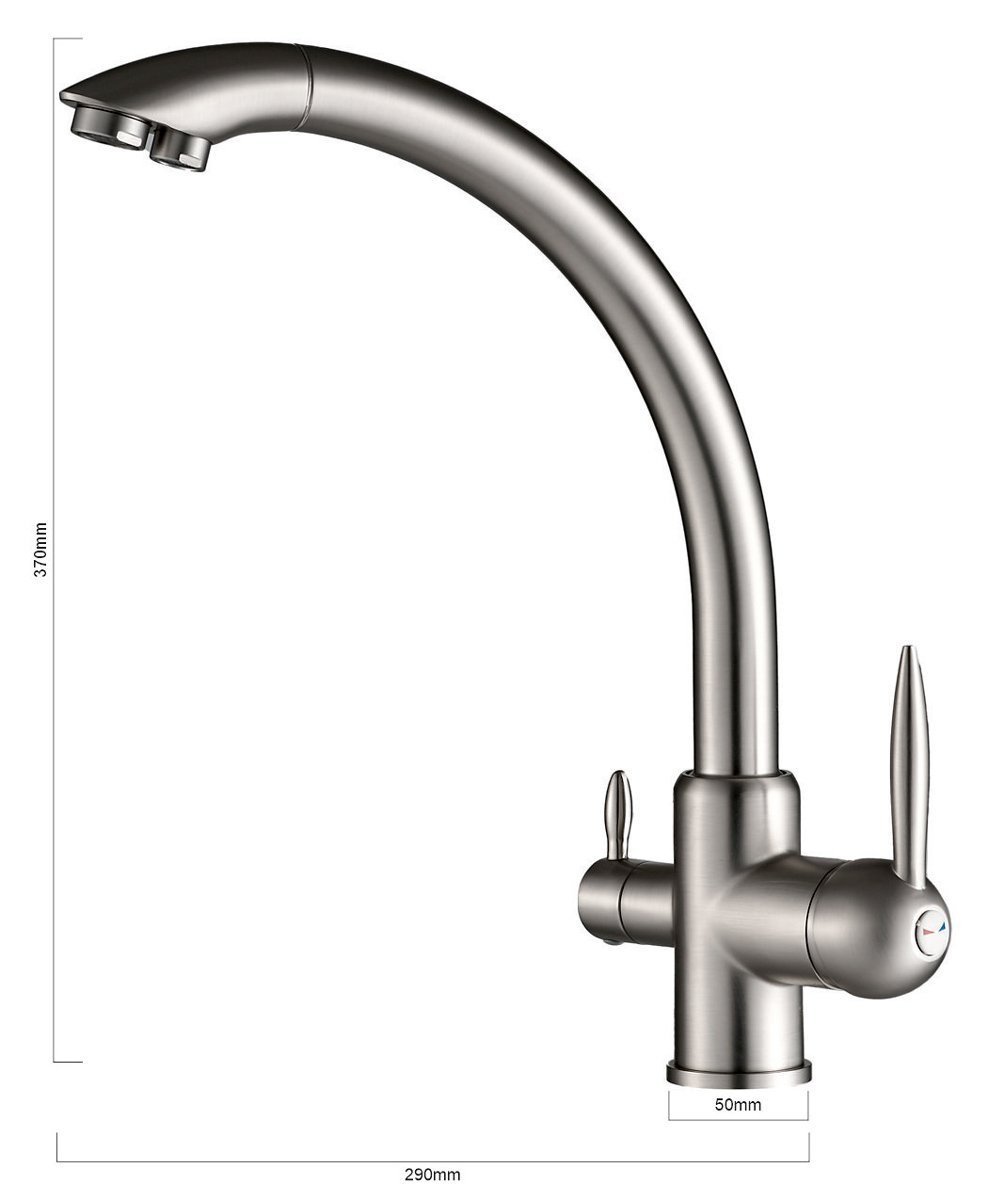 Αυτή η μπαταρία πάγκου κουζίνας διαθέτει τρίοδο σχεδιασμό για τη σύνδεση με φίλτρο νερού και το δίκτυο παροχής ζεστού και κρύου νερού. Έτσι, μπορείτε να απολαμβάνετε καθαρό, φιλτραρισμένο νερό και να επιλέξετε παράλληλα ανάμεσα σε ζεστό και κρύο νερό με τους διακόπτες.