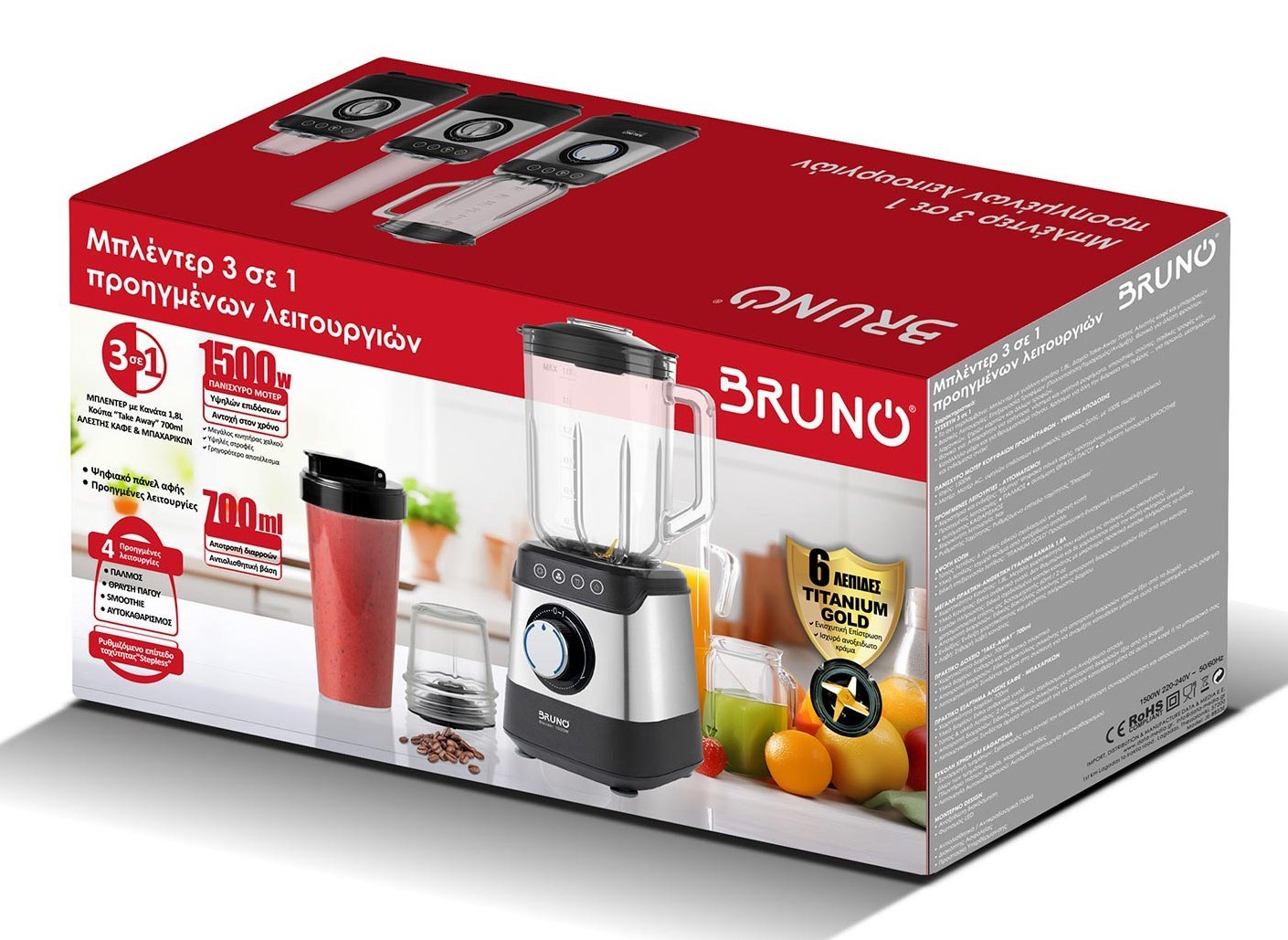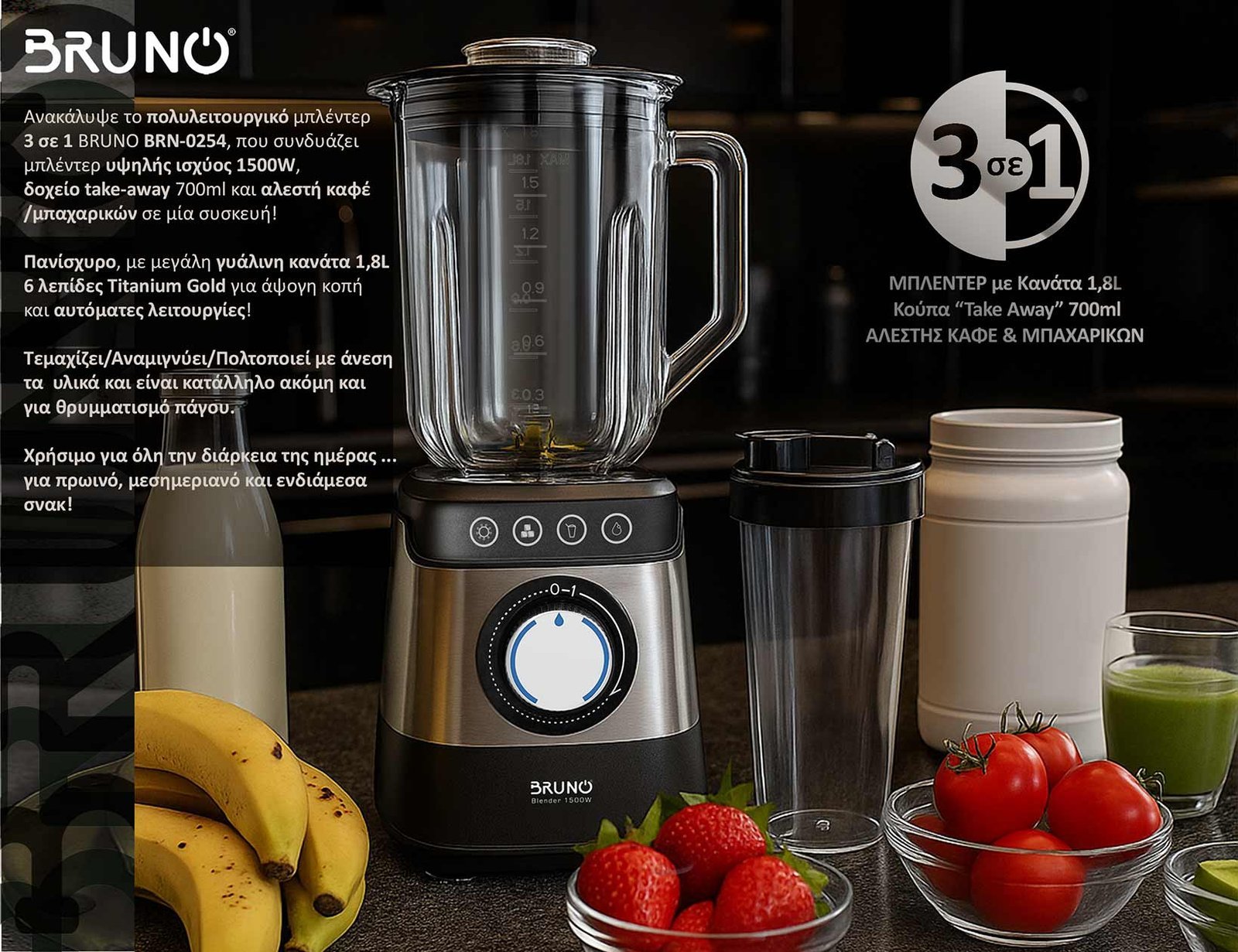 Ανακάλυψε το πολυλειτουργικό μπλέντερ BRUNO 3 σε 1, που συνδυάζει μπλέντερ υψηλής ισχύος (1500W), δοχείο take-away 700ml και αλεστή καφέ/μπαχαρικών σε μία συσκευή!