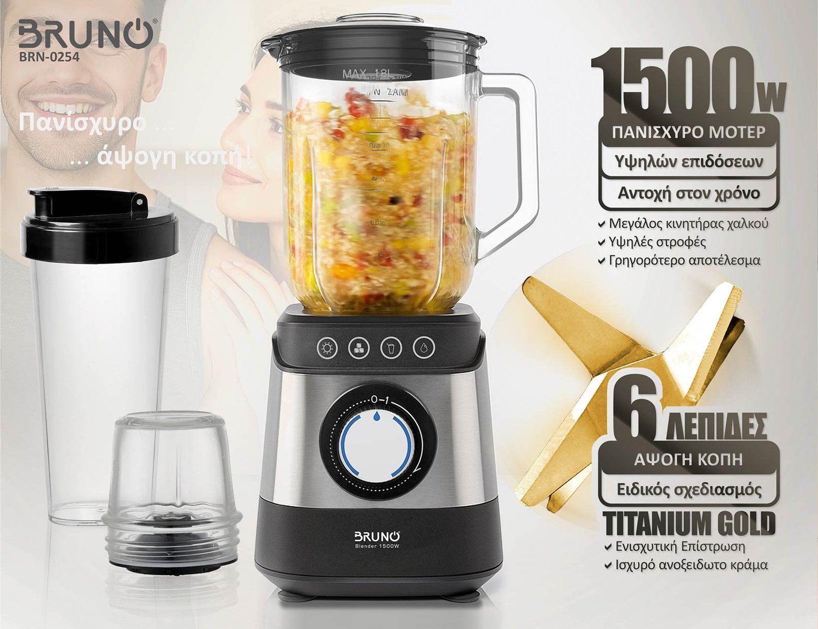 Το σετ περιλαμβάνει: Μπλέντερ με γυάλινη κανάτα 1,8L, Δοχείο Take-Away 700ml, Αλεστής καφέ και μπαχαρικών