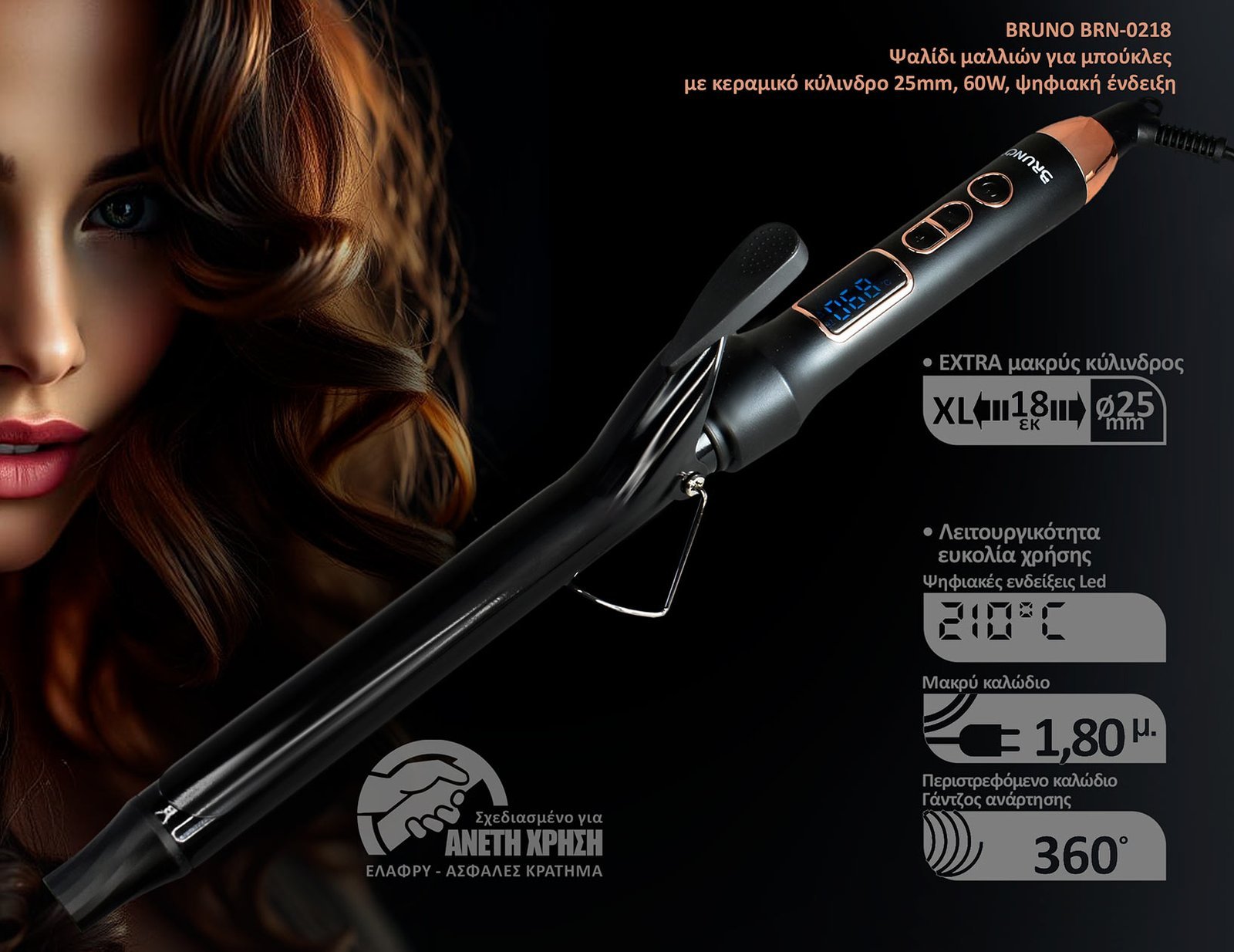 BRUNO ψαλίδι μαλλιών για μπούκλες BRN-0218 με κεραμικό κύλινδρο 25mm, 60W, ψηφιακή ένδειξη, black-copper