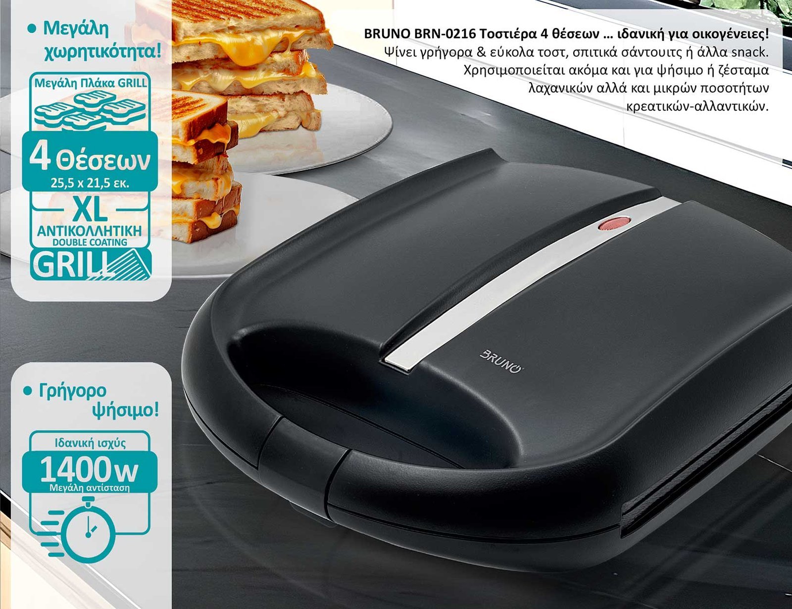Η Ψηστιέρα-Τοστιέρα για 4 τοστ BRUNO BRN-0216 είναι ιδανική για ψήσιμο τοστ, σπιτικών σάντουιτς και άλλων snack σε σύντομο χρόνο.