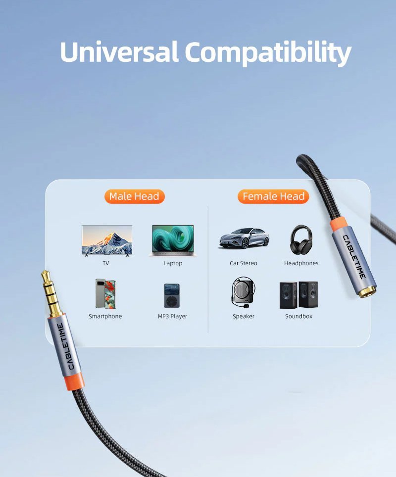 Καλώδιο 3.5mm αρσενικό σε θηλυκό της Cabletime ιδανικό για την προέκταση συνδέσεων μεταξύ υπολογιστών, smartphone, ακουστικών, ηχείων και άλλων συσκευών ήχου.