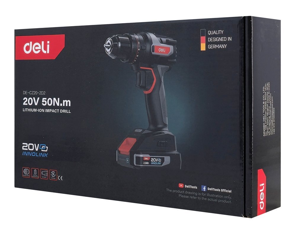 DELI κρουστικό δραπανοκατσάβιδο μπαταρίας DE-CZ20-2D2, Brushless, 20V, 2x 2Ah, 50N.m
