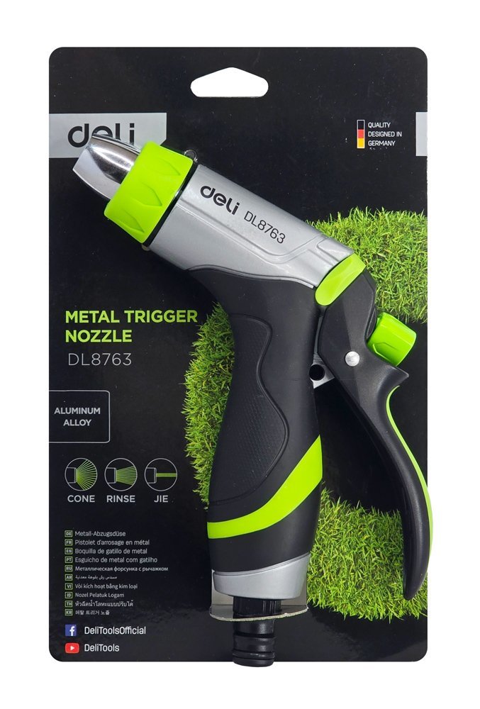 Πιστόλι εκτόξευσης νερού της Deli με 3 λειτουργίες ψεκασμού. Διαθέτει αντιολισθητική λαβή που εφαρμόζει καλά στο χέρι για πιο ξεκούραστο πότισμα.