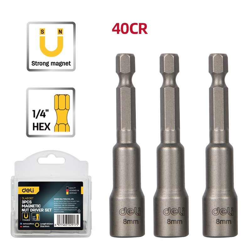 DELI σετ καρυδάκια DL4808T για δραπανοκατσάβιδο, μαγνητικά, 8mm, εξάγωνα, 3τμχ