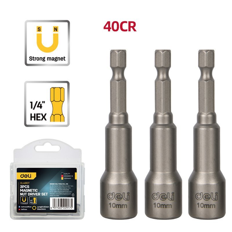 DELI σετ καρυδάκια DL4810T για δραπανοκατσάβιδο, μαγνητικά, 10mm, εξάγωνα, 3τμχ