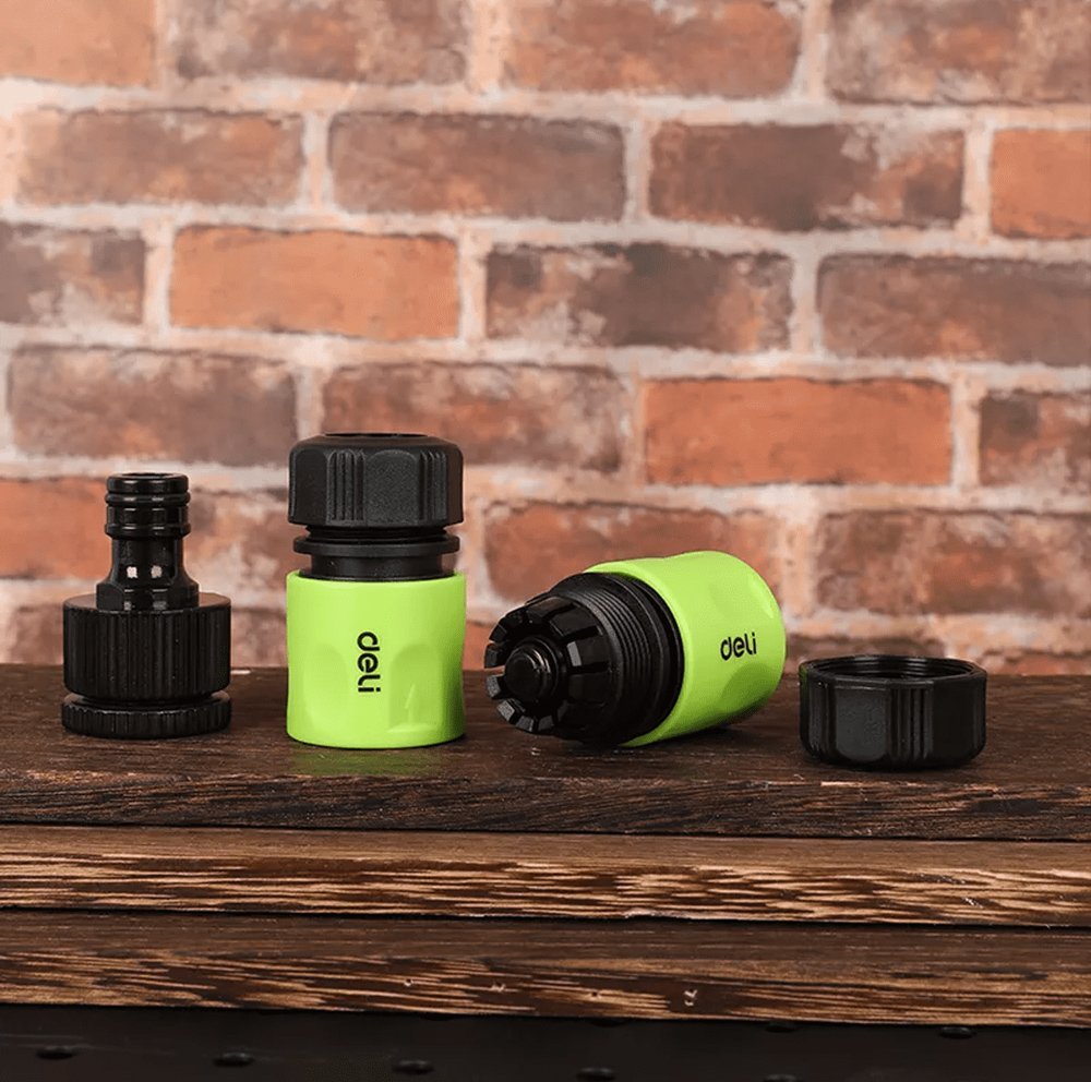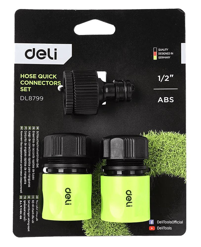 Σετ ποτίσματος κήπου της Deli που αποτελείται από ένα ρακόρ με εσωτερικό σπείρωμα 3/4" και απόληξη 1/2" και δυο ταχυσυνδέσμους για λάστιχο ποτίσματος 1/2".