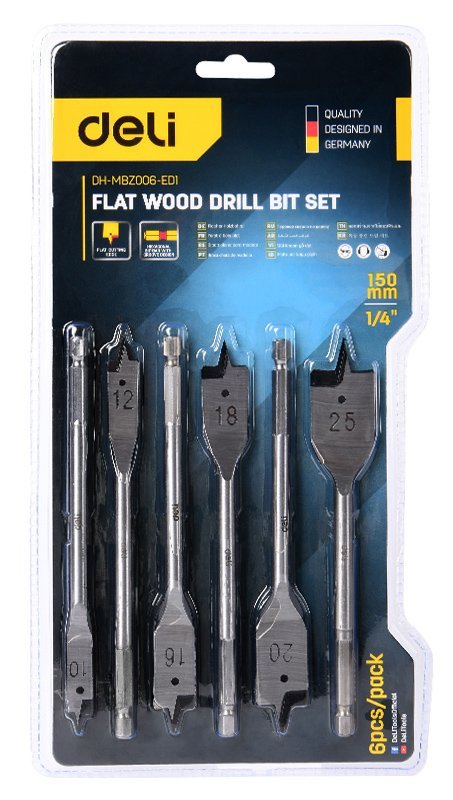 Σετ τρυπάνια φτερού της DELI που αποτελείται από 6 τρυπάνια διαφορετικού μεγέθους, κατάλληλα για χρήση σε ξύλινες επιφάνειες.