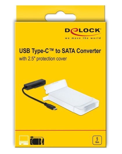 Αυτός ο αντάπτορας USB-C σε SATA της Delock μπορεί να χρησιμοποιηθεί για την σύνδεση ενός 2.5" SATA HDD ή SSD με έναν επιτραπέζιο ή φορητό υπολογιστή. Μαζί με τον αντάπτορα συμπεριλαμβάνεται και θήκη προστασίας για την εισαγωγή ενός SSD ή HDD με ύψος έως 9.5mm.