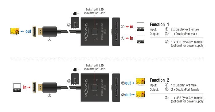 Αυτό το DisplayPort switch από τη Delock είναι ένα bidirectional switch για τη σύνδεση διαφορετικών συσκευών με υποδοχή DisplayPort.