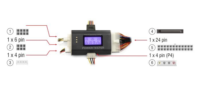 Voltage test: +12 V, -12 V, +5 V, +3.3 V 5 V Stand By (SB), 12 V Power Good (PG)