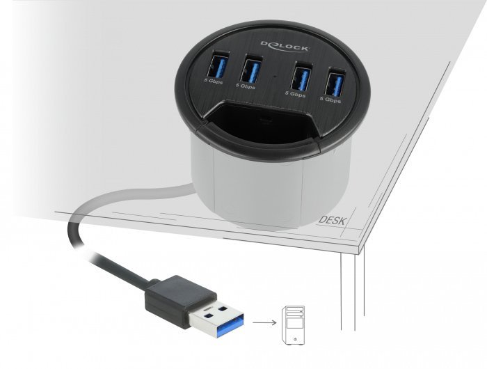 Αυτό το USB hub της Delock μπορεί να τοποθετηθεί σε μια υπάρχουσα εγκοπή στο γραφείο σας και να συνδεθεί με τον υπολογιστή σας μέσω θύρας USB για να επεκτείνει τις θύρες του με 4x USB 3.2 θύρες.