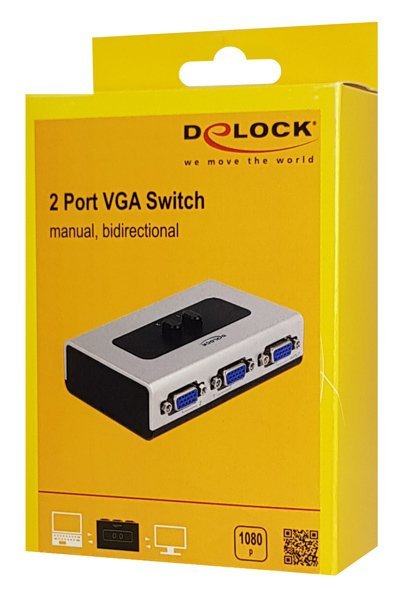 Bidirectional switch της Delock 2 θυρών, διπλής κατεύθυνσης για την σύνδεση συσκευών με θύρα VGA. Το switch καθιστά δυνατή την σύνδεση 2 συσκευών εικόνας με θύρα VGA σε ένα υπολογιστή ή 1 συσκευή εικόνας με θύρα VGA σε 2 υπολογιστές.