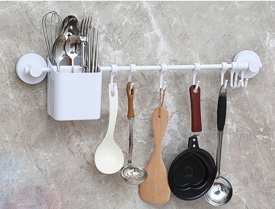 Θήκη της Ecoco με στήριξη σε κρεμάστρα κουζίνας. Μπορεί να τοποθετηθεί εύκολα στην κρεμάστρα χωρίς την χρήση εργαλείων ως έξτρα θήκη για κουταλιά, πιρούνια ή άλλα παρόμοια σκεύη κουζίνας. Διαθέτει σχεδιασμό με αγωγούς αποστράγγισης στο κάτω μέρος της θήκης ενώ το συνολικό βάρος αντοχής της είναι 5kg.