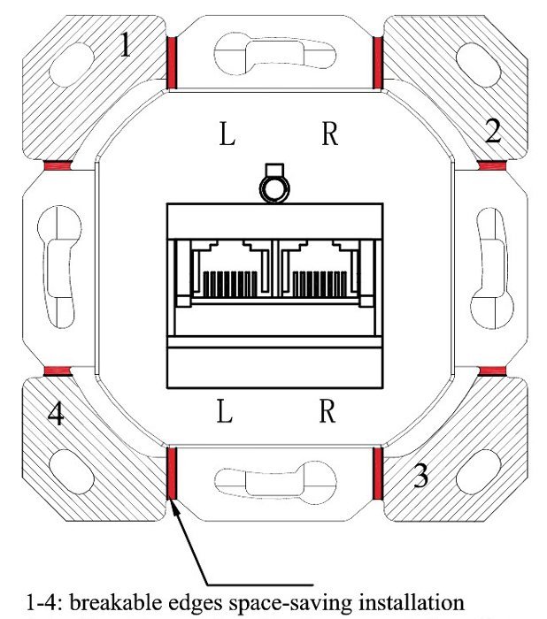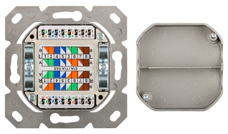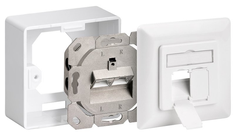 Επιτοίχια πρίζα με 2 θύρες δικτύου για σύνδεση καλωδίων με βύσμα RJ45. Είναι θωρακισμένη, ικανή για ταχύτητες 10 GBit Ethernet και ιδανική για χρήση PoE+ IEEE 802.3at.