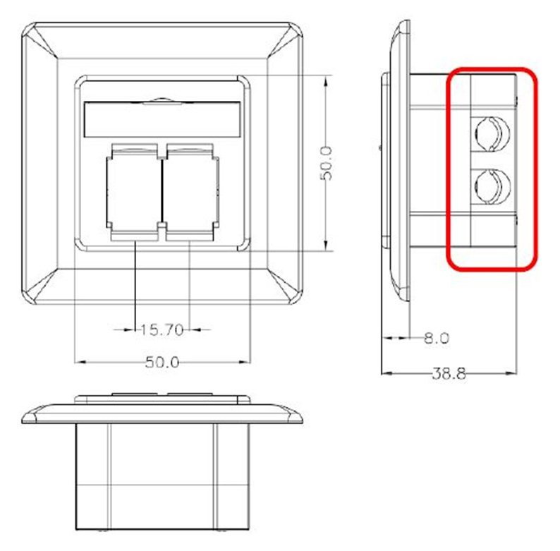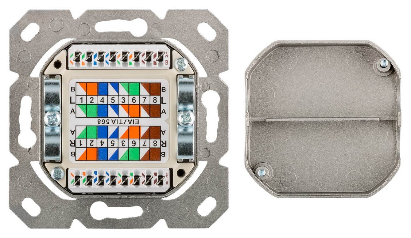 Επιτοίχια πρίζα με 2 θύρες δικτύου για σύνδεση καλωδίων με βύσμα RJ45. Είναι θωρακισμένη, ικανή για ταχύτητες 10 GBit Ethernet και ιδανική για χρήση PoE+ IEEE 802.3at.