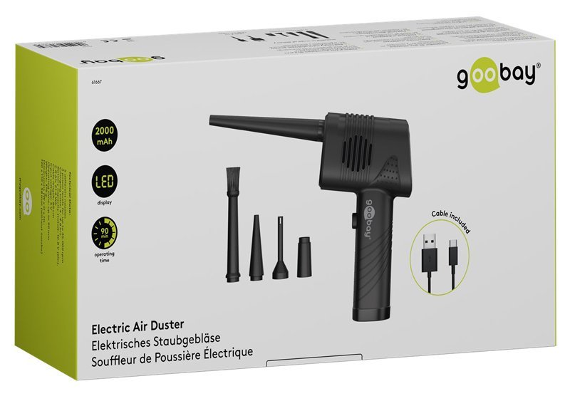 Ηλεκτρικό air duster της Goobay, κατάλληλο για την απομάκρυνση της σκόνης από αξεσουάρ και οικιακά αντικείμενα όπως πληκτρολόγια, PC cases, κλιματιστικά, ηλεκτρονικές συσκευές κ.α.