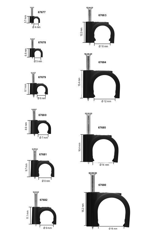 Ρόκα ιδανικά για την στήριξη καλωδίων σε τοίχους, κουφώματα θυρών και γωνίες. Είναι κατασκευασμένα από υψηλής ποιότητας πλαστικό με γαλβανισμένα ατσάλινα καρφιά. Μπορούν να χρησιμοποιηθούν τόσο σε εσωτερικούς όσο και εξωτερικούς χώρους. Η συσκευασία περιλαμβάνει 100 τεμάχια, τοποθετημένα μέσα σε βολικό πλαστικό κουτί αποθήκευσης.