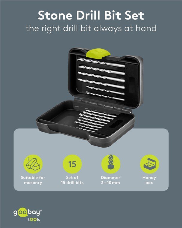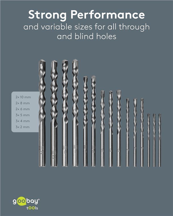 Σετ τρυπάνια της Goobay που αποτελείται από 15 τρυπάνια σε διαφορετικά μεγέθη, κατάλληλα για χρήση σε τοίχους και μπετόν.