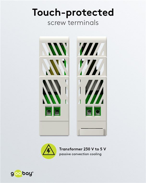 Τροφοδοτικό της Goobay με απόδοση έως 12W, κατάλληλο για θυροτηλέφωνα, συστήματα ασφαλείας, συστήματα αυτοματισμού κ.α. Η τοποθέτηση του γίνεται εύκολα σε DIN ράγα TH 35/7.5 ή TH 35/15.