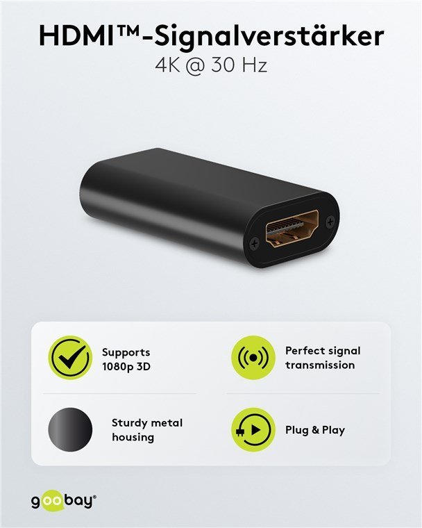 Το HDMI repeater της Goobay ενισχύει το σήμα μετάδοσης σε συνδέσεις συσκευών εισόδου όπως PC με συσκευές εξόδου όπως οθόνες για αποστάσεις έως 40 μέτρων.