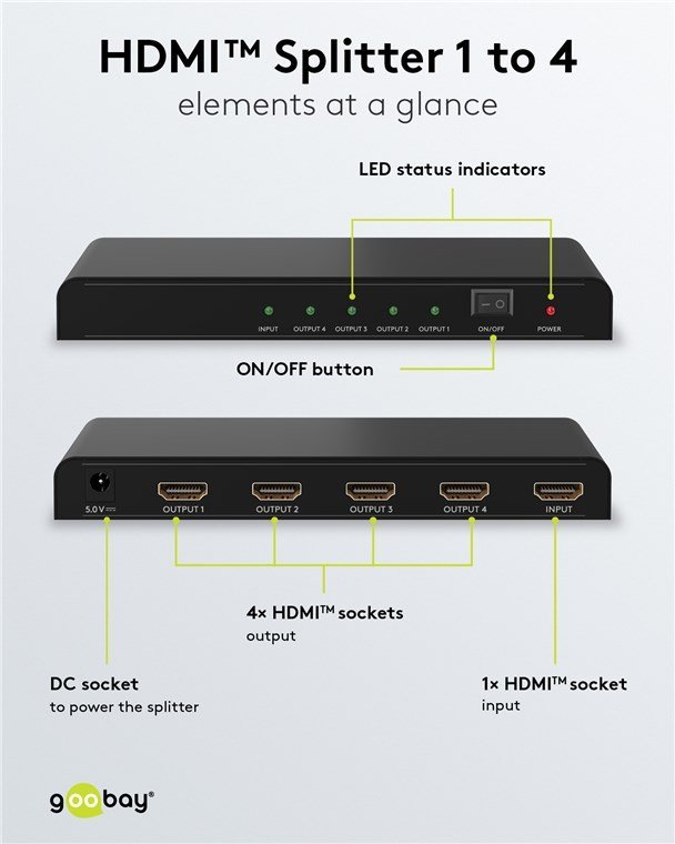 Το HDMI splitter της Goobay σας επιτρέπει την σύνδεση 1x συσκευής εισόδου όπως PC σε 4x συσκευών εξόδου όπως οθόνες.