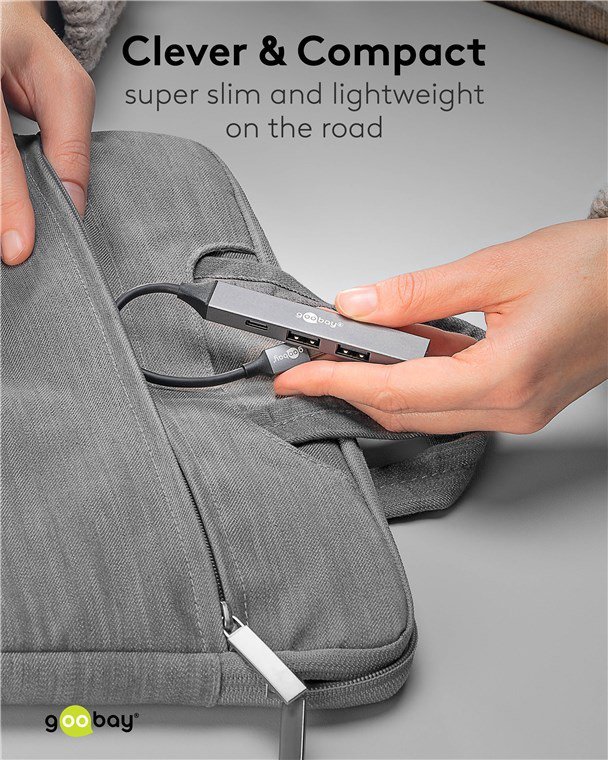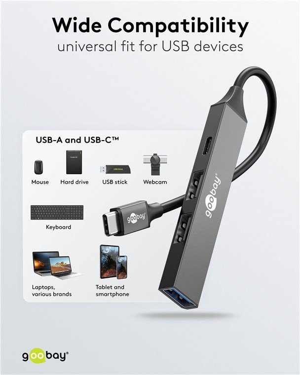 Αυτό το hub της Goobay μπορεί να συνδεθεί με το laptop ή το desktop σας μέσω θύρας USB-C και να επεκτείνει τις θύρες του με 1x USB-C και 3x USB θύρες. Διαφορετικές συσκευές USB, όπως εξωτερικοί σκληροί δίσκοι, card readers, ποντίκια κλπ. μπορούν να συνδεθούν μέσω του hub.