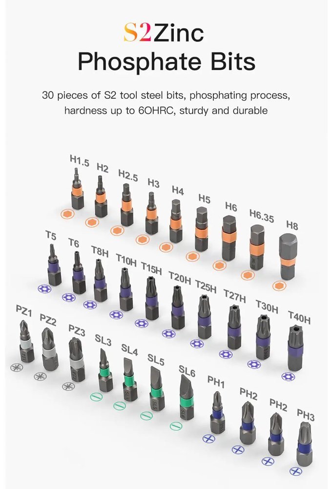 Στη συσκευασία συμπεριλαμβάνονται 30 μύτες κατσαβιδιού, επέκταση κατσαβιδιού, αντάπτορας κατσαβιδιού, μαγνητιστής/απομαγνητιστής, καλώδιο φόρτισης και υφασμάτινη θήκη μεταφοράς.