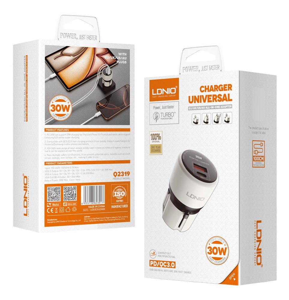 Φορτιστής τοίχου από την LDNIO, κατάλληλος για χρήση με τύπους πριζών EU (Ευρώπης), UK (Αγγλίας), US (Αμερικής) και AU (Αυστραλίας). Η εναλλαγή της πρίζας γίνεται εύκολα με συρόμενο κουμπί. Εξοπλίζεται με USB και USB-C θύρες εξόδου, για την φόρτιση συσκευών, με μέγιστη απόδοση 30W.