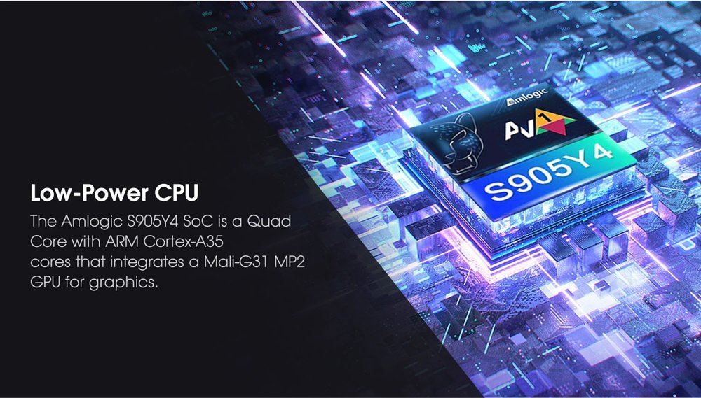 -CPU: Amlogic S905Y4 Quad core ARM Cortex-A35, 16500 DMIPS