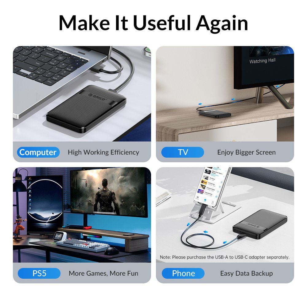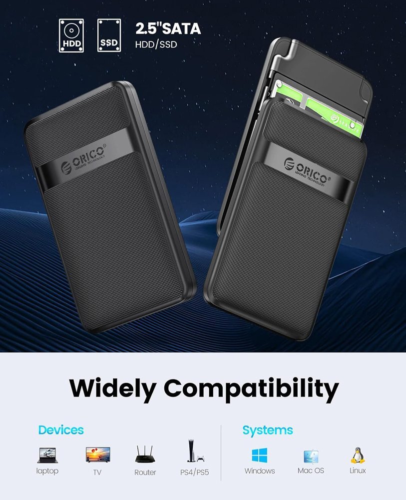Η θήκη της ORICO επιτρέπει την σύνδεση ενός 2.5" SATA HDD ή SSD με έναν επιτραπέζιο ή φορητό υπολογιστή μέσω θύρας USB.
