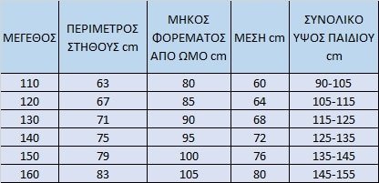 ΠΡΟΣΟΧΗ: Μετρήστε το παιδί από τον ώμο μέχρι κάτω και την περίμετρο στήθους και βρείτε το κατάλληλο μέγεθος από την παρακάτω ταμπέλα. Οι διαστάσεις στη παρακάτω ταμπέλα είναι οι πραγματικές διαστάσεις του ρούχου. Μετρώντας π.χ. το παιδί από τον ώμο μέχρι κάτω βλέπετε στη ταμπέλα ποιο μέγεθος ταιριάζει καλύτερα, δηλαδή πού θα φτάσει το ρούχο.