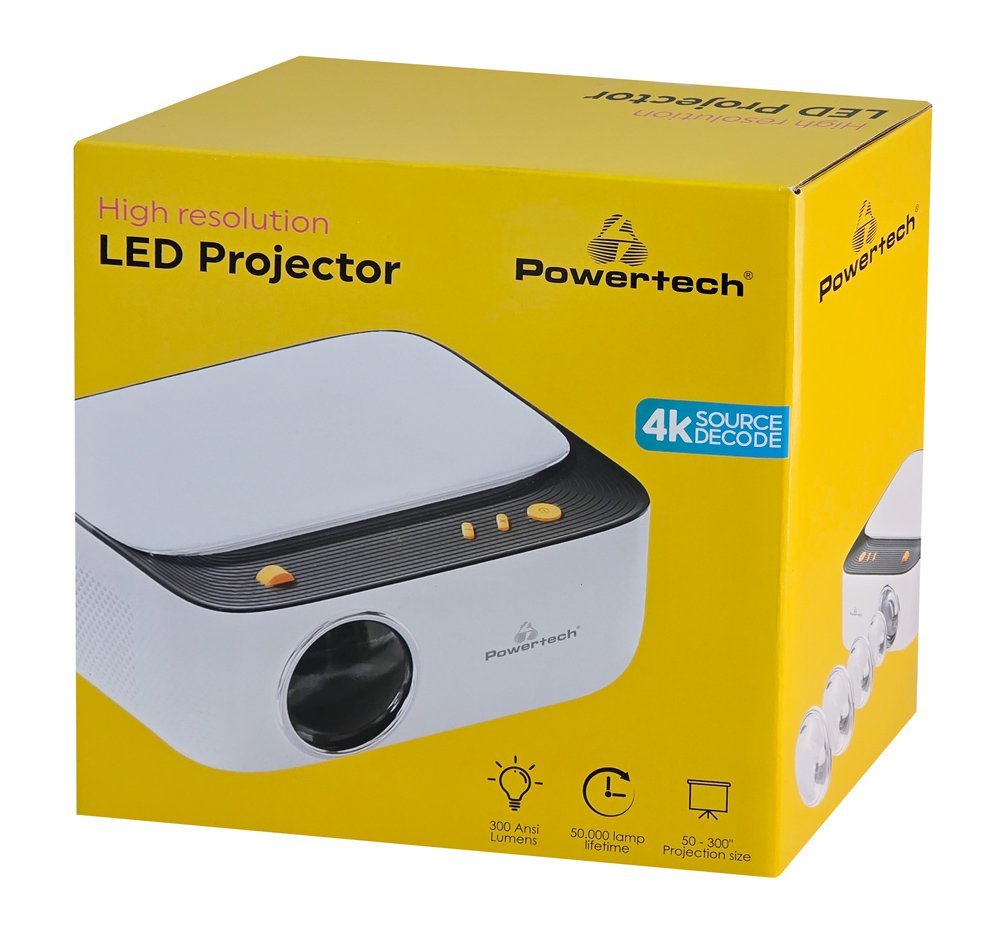 O LED βιντεοπροβολέας της Powertech προσφέρει μοναδικές δυνατότητες. Διαθέτει λυχνία LED με μεγάλη διάρκεια ζωής 50.000 ωρών και ισχυρό ενσωματωμένο ηχείο 3W. Μπορεί να προβάλει εικόνα μεγέθους έως 300" με φωτεινότητα 300 ANSI lumens και Full HD ανάλυση.