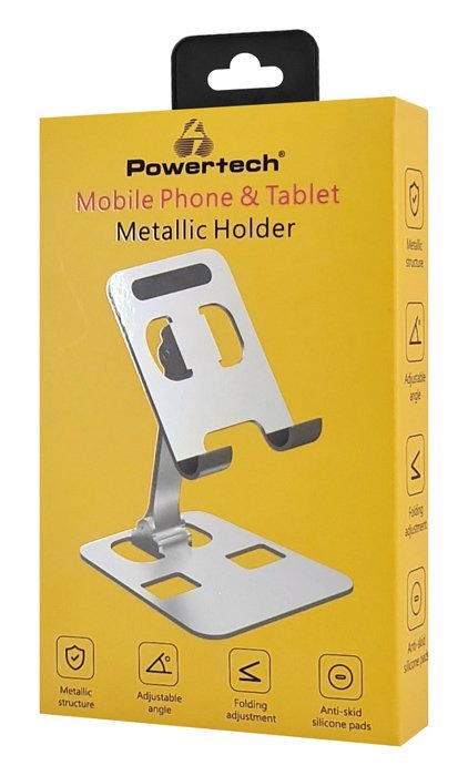 Επιτραπέζια, μεταλλική βάση της Powertech για smartphone και tablet έως 10". Στιβαρή, πλήρως ρυθμιζόμενη και εξαιρετικά σταθερή (δεν χάνει την ρύθμιση της από το βάρος), είναι ιδανική για χρήση στο γραφείο. Είναι foldable, για εύκολη μεταφορά σε τσάντα ή σακίδιο.