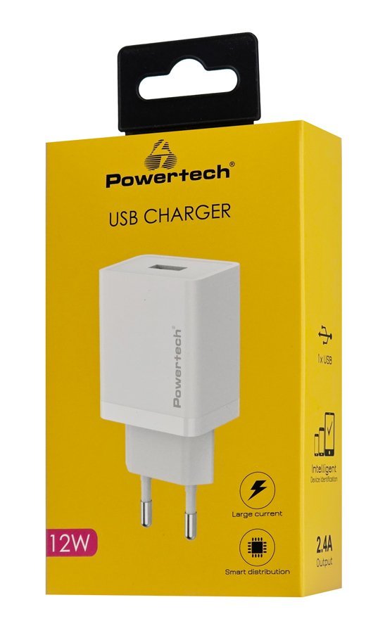 Υψηλής απόδοσης φορτιστής τοίχου της Powertech, κατασκευασμένος από ανθεκτικό υλικό και συμβατός με συσκευές που φορτίζουν μέσω θύρας USB. Διαθέτει 1x USB θύρα εξόδου που υποστηρίζει φόρτιση με απόδοση έως 12W.