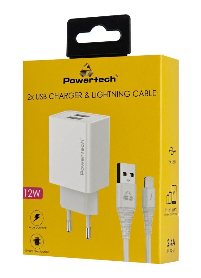 POWERTECH φορτιστής τοίχου PT-1325 με καλώδιο Lightning, 2x USB, 12W, λευκός