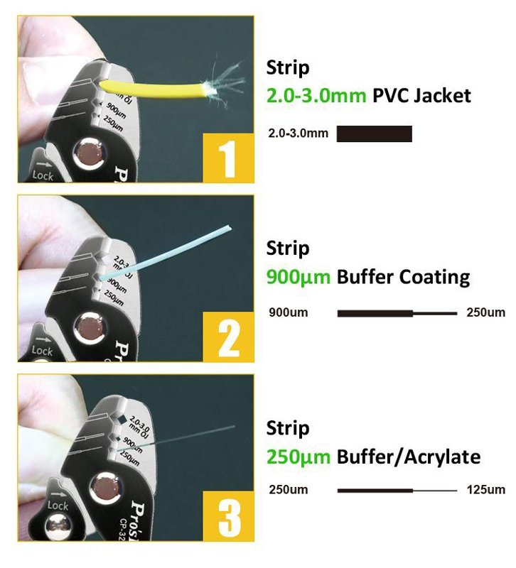 -Strips the 2.0-3.0mm fiber jacket down to the 900μm buffer insulation.