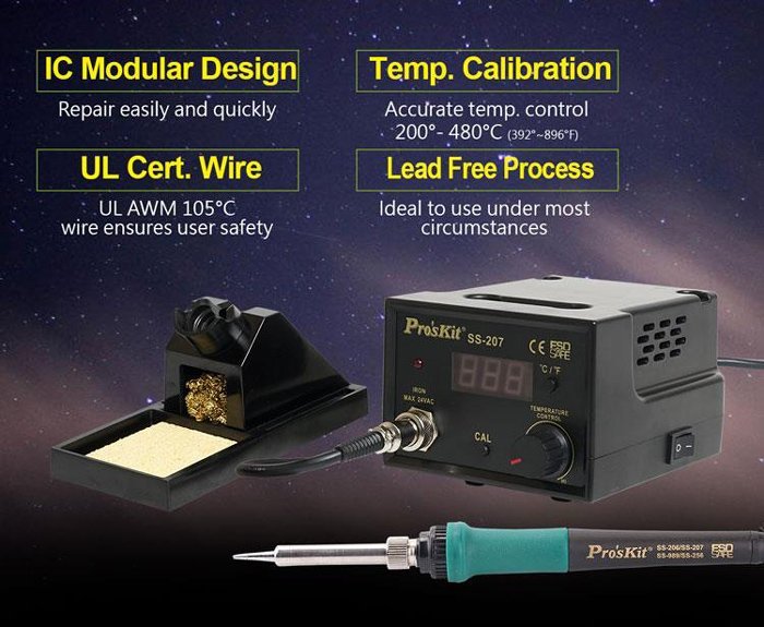 Ο σταθμός συγκόλλησης SS-207B της PROSKIT είναι ένα πρακτικό εργαλείο συγκόλλησης με ισχύ 60W και ρυθμιζόμενη θερμοκρασία από 200 έως 480 °C.