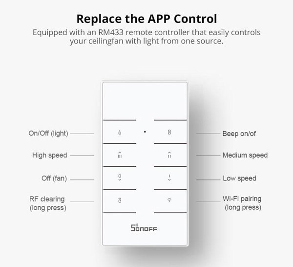 Είναι ένας Wi-Fi διακόπτης που σας επιτρέπει να ελέγχετε απομακρυσμένα ανεμιστήρες οροφής αλλά και τον φωτισμό του σπιτιού σας μέσω της εφαρμογή eWeLink από το smartphone σας. Μπορείτε να απενεργοποιήσετε ανά πάσα στιγμή τον ανεμιστήρα ή τον φωτισμό από όπου και αν βρίσκεστε ή να καθορίσετε προκαθορισμένο χρόνο για την ενεργοποίηση και απενεργοποίηση του.